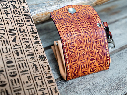 Intricately engraved wooden stamp featuring Egyptian-inspired hieroglyphics symbols, perfect for leathercraft. Creates bold, detailed impressions and adds a unique artisan touch to every handmade project. Crafted from high-quality plywood, this stamp ensures clean and precise impressions.